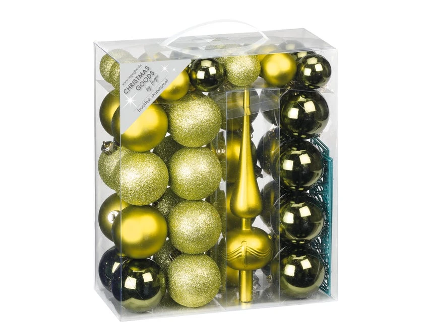 Der Baumschmuck in Olive-grün-Mix mit einem Durchmesser von 4 cm und 6 cm ist inkl. schöner Spitze.