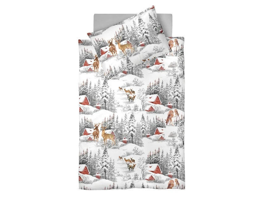 Herrlich weich und anschmiegsam ist die kuschelige Bettwäsche in Köperflanell. Die Rehe und die Landschaft bringen Abwechslung und winterliche Stimmung ins Schlafzimmer. Die Bettwäsche besteht aus Polsterbezug in der Größe 70×90 cm und Tuchentbezug in der Größe 140×200 cm. Ausgestattet mit einem praktischen Reißverschluss lässt sich die Bettwäsche aus reiner Baumwolle bei 60 Grad in der Waschmaschine waschen. Einsprung: 3%.