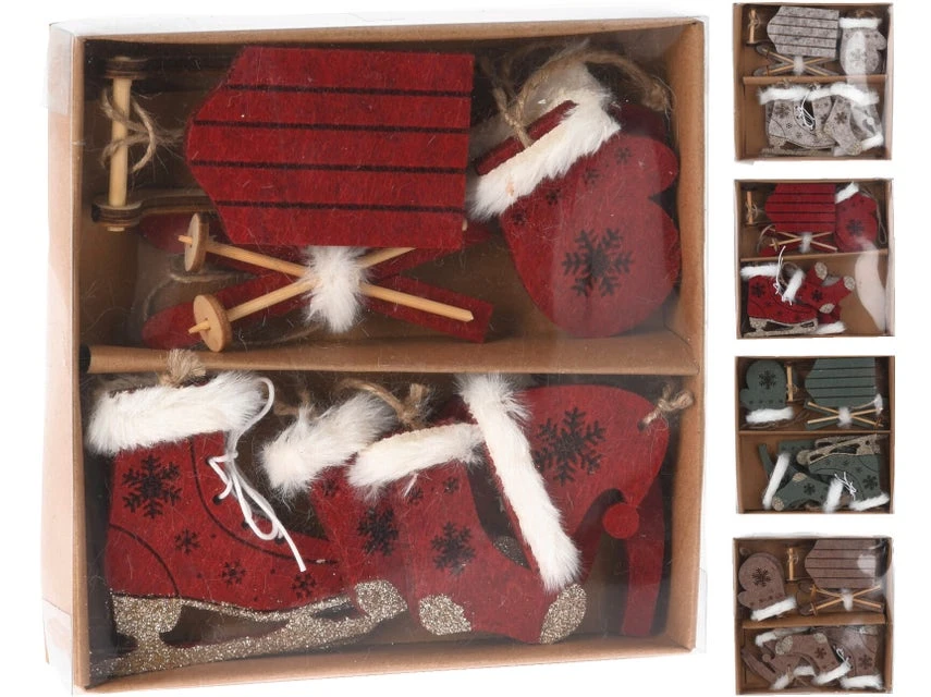 Bestehend aus: je 1x Schlitten, Schi, Mütze, Pulli und je 2x Fäustling, Socken, Eislaufschuhe.