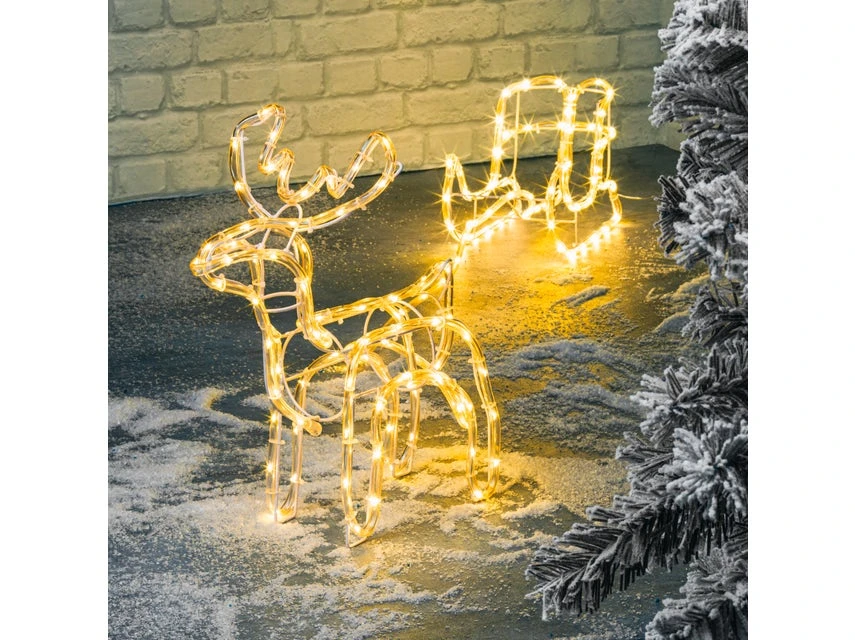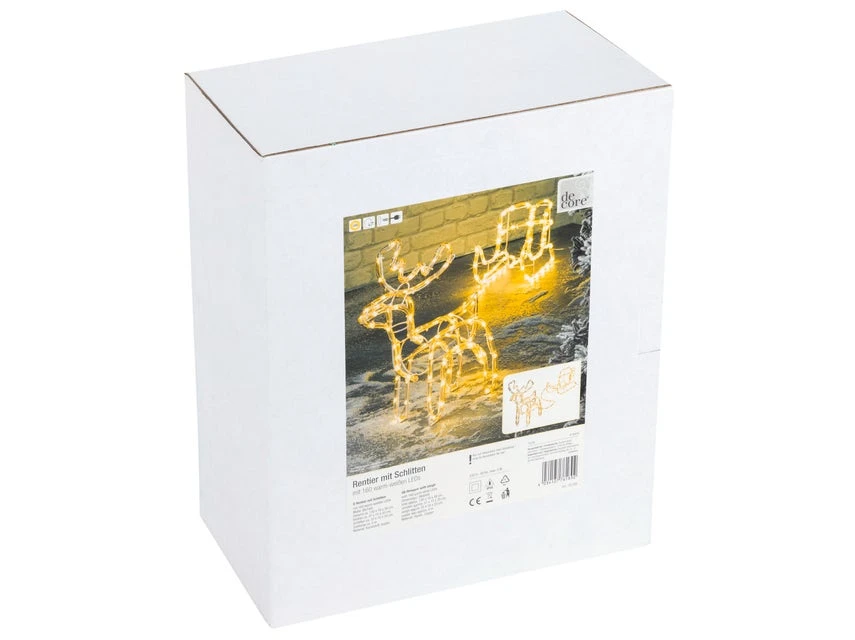Einfach traumhaft im Garten, auf der Terrasse oder im Eingangsbereich! Der Höhepunkt Ihrer Weihnachtsbeleuchtung und eine ganz besondere Dekoration für stimmungsvolle Abende ist dieses LED-Rentier mit Schlitten! 160 warmweiße LEDs lassen das Rentier dank des transparenten Lichtschlauches in einem weißen Licht erstrahlen!