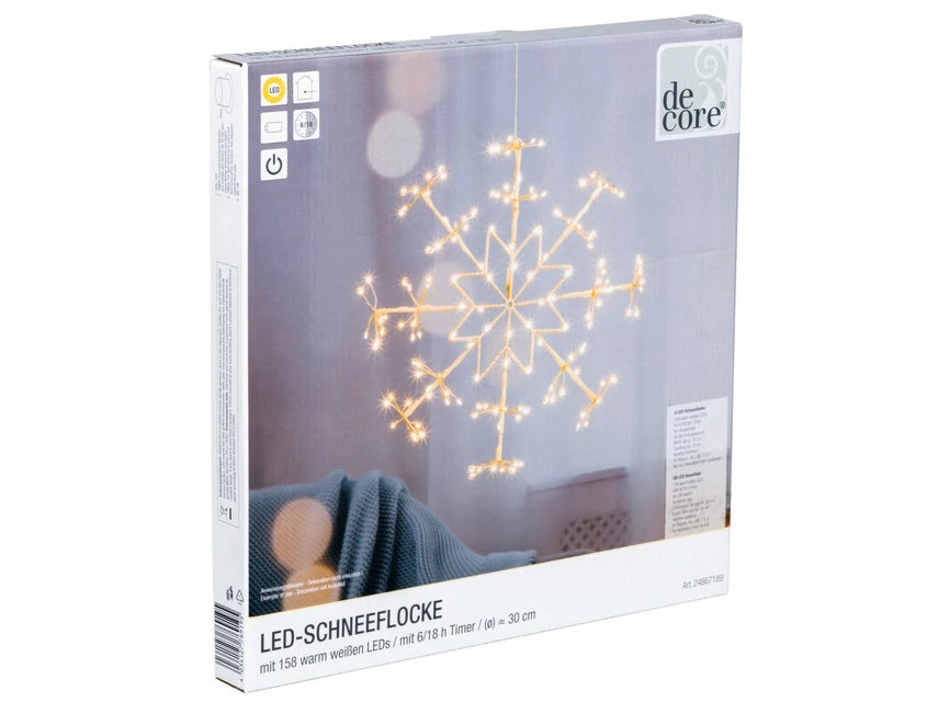 Mit warmweißen LED-Lichtern sorgt diese strahlende LED-Schneeflocke für eine festliche und stimmige Weihnachtsbeleuchtung. Die Schneeflocke ist für den Innenbereich bestens geeignet.