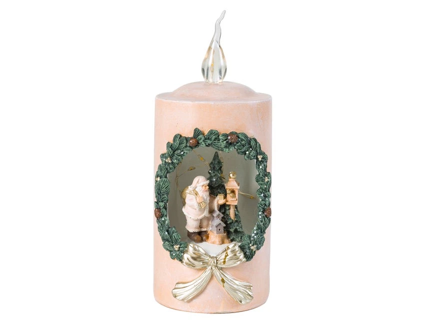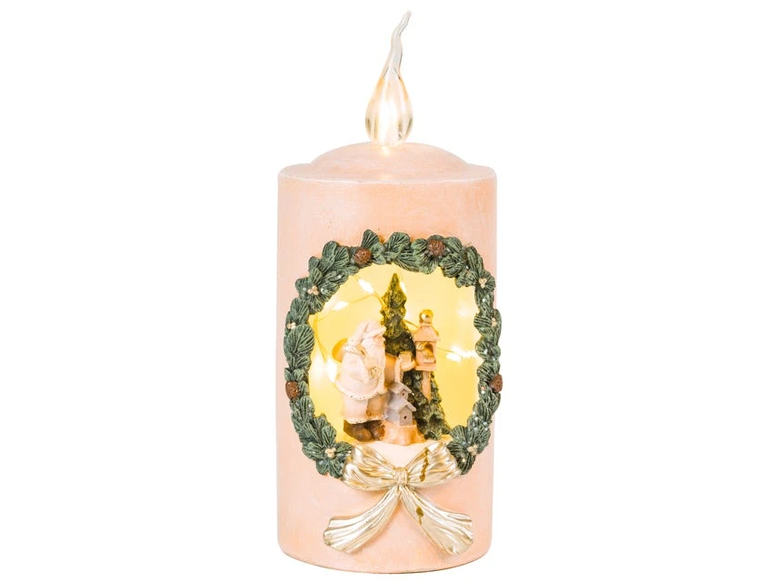 Die LED-Stumpenkerze ist mit einem Santamotiv versehen.