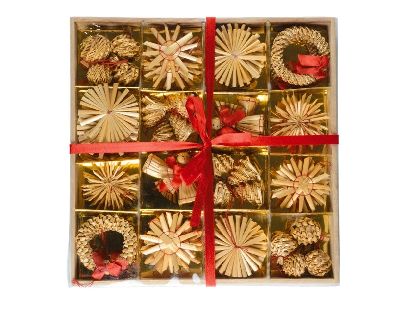 Mit einem Durchmesser von ca. 3 – 6 cm wird diese Strohdeko im 56er-Set zum Highlight in der Weihnachtszeit. Die verschiedenen Strohdekoelemente sind zum Hängen.