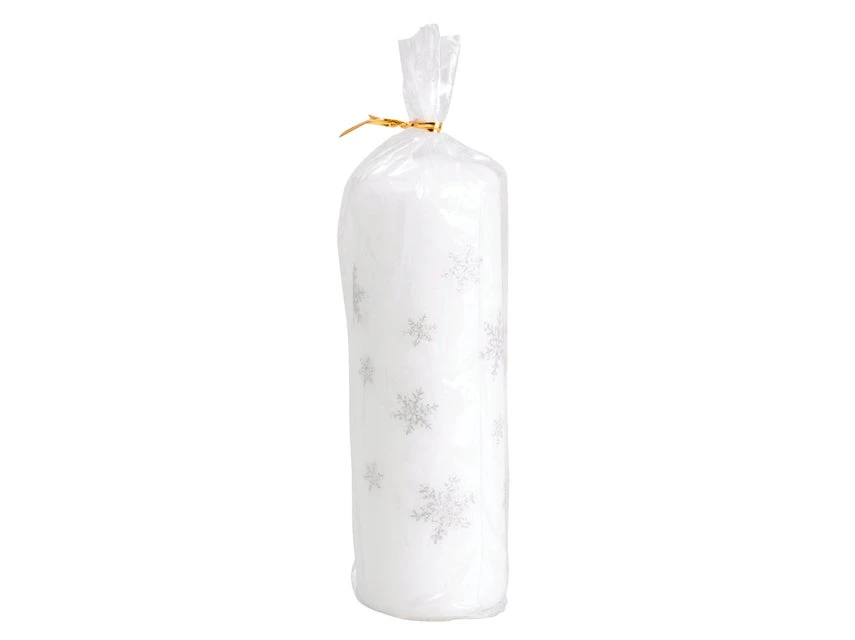 Die Stumpenkerze ist mit einem schönen Druck in Form einer Schneeflocke versehen.